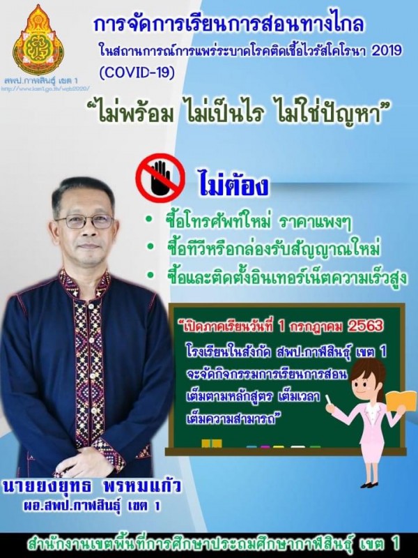 19/5/2563 นายยงยุทธ พรหมแก้ว ผู้อำนวยการสพป.กาฬสินธุ์เขต 1 ร.ร.สามชัยอุดมวิทย์พร้อมปฏิบัติตามนโยบาย เพื่อผ่านวิกฤตินี้ไปด้วยกัน